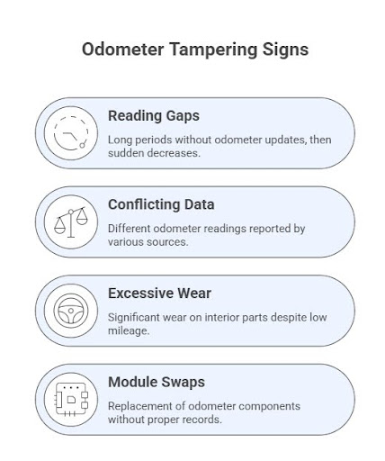Odometer | Entries, gaps, inconsistencies | Screens for rollback and hidden problems |